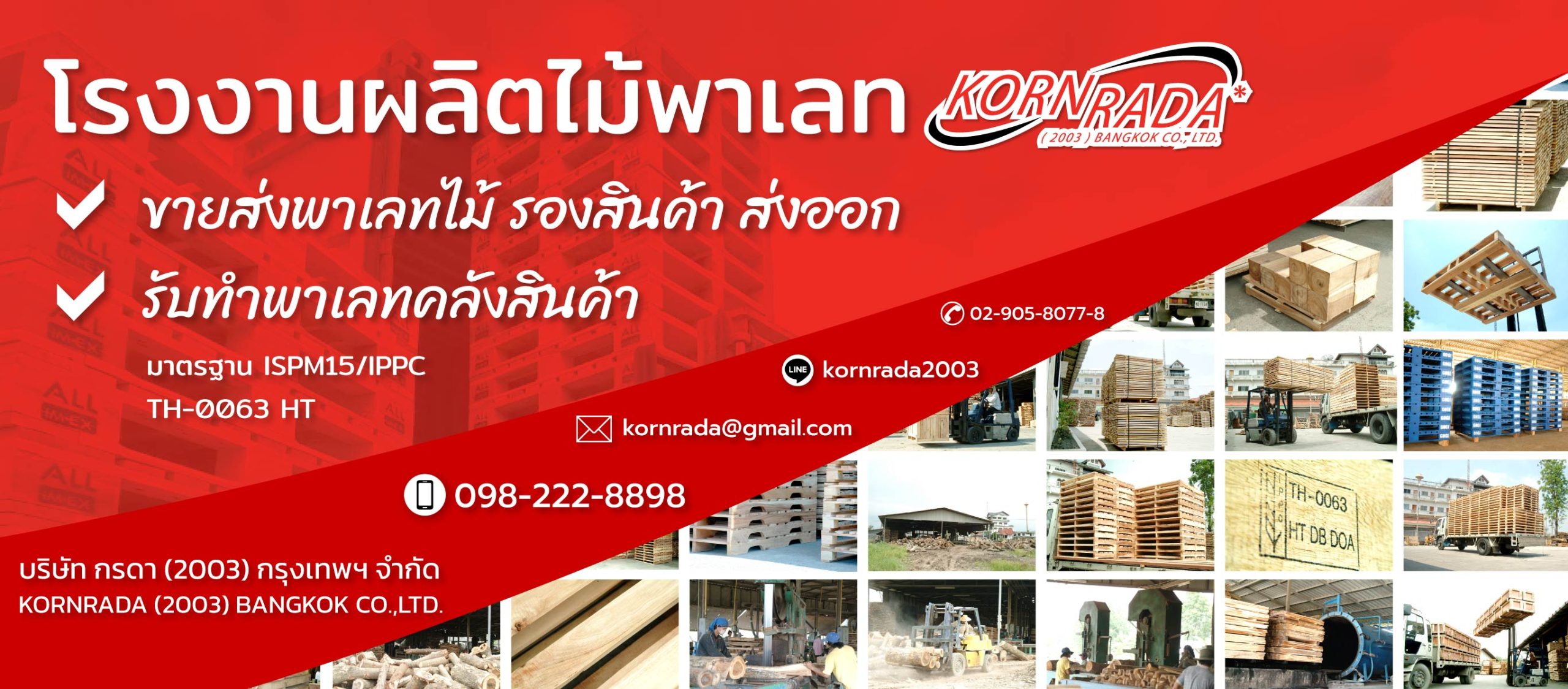 กรดา | KORNRADA (2003) BANGKOK COMPANY LIMITED บริษัทพาเลทไม้ ใกล้กรุงเทพฯ โรงงานของเราตั้งอยู่ที่ ถนนรังสิต-นครนายก จ.ปทุมธานี เราขายไม้พาเลท เกรด ISPM15 / IPPC หลากหลายขนาด ตามความต้องการใช้งานพาเลทของลูกค้า เราสามารถสต็อควัตถุหลัก คือ ไม้พาเลทที่ทำจากไม้ยางพารา, ไม้เบญจพรรณรวม ไว้ให้ลูกค้าที่มีความต้องการใช้งานต่อเนื่องตลอดทั้งปี เพียงท่านแจ้งความประสงค์กับเรา หมดปัญหาเรื่องการขาดตอนในการใช้งานพาเลทไม้ได้เลย